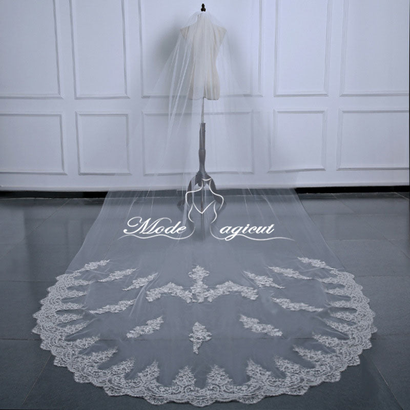 #12308019 3.5*1.6 Meter One-Tier Sequins Lace Applique Edge Cathedral Bridal Veil with Comb
