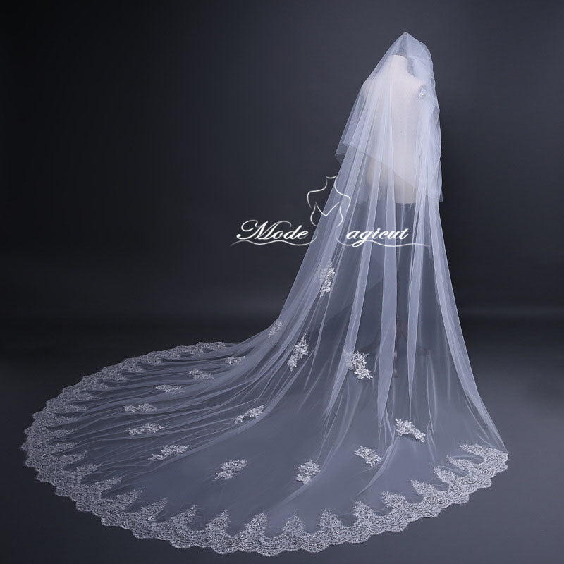 #20308016 3.8*3 Meter Sequins Lace Applique Edge 2-Tier Cathedral Bridal Veil | For Wedding