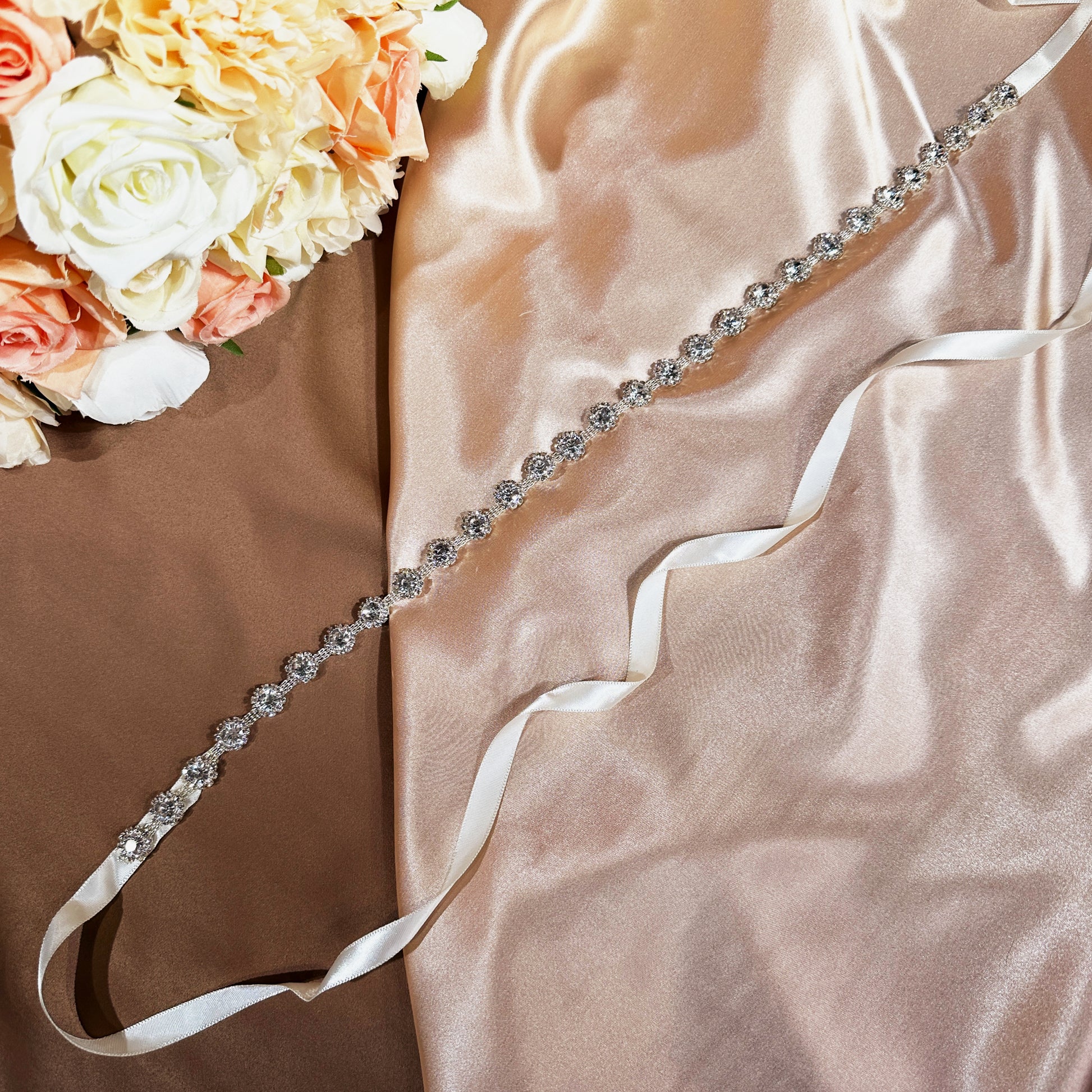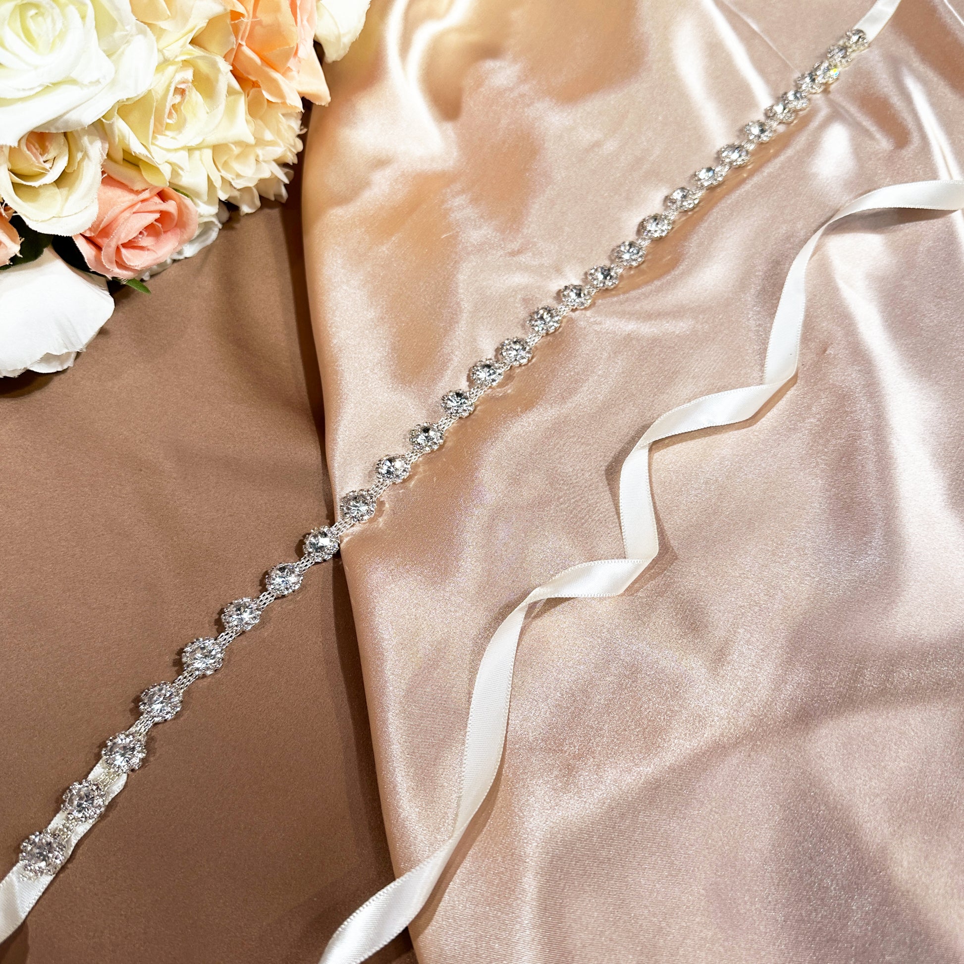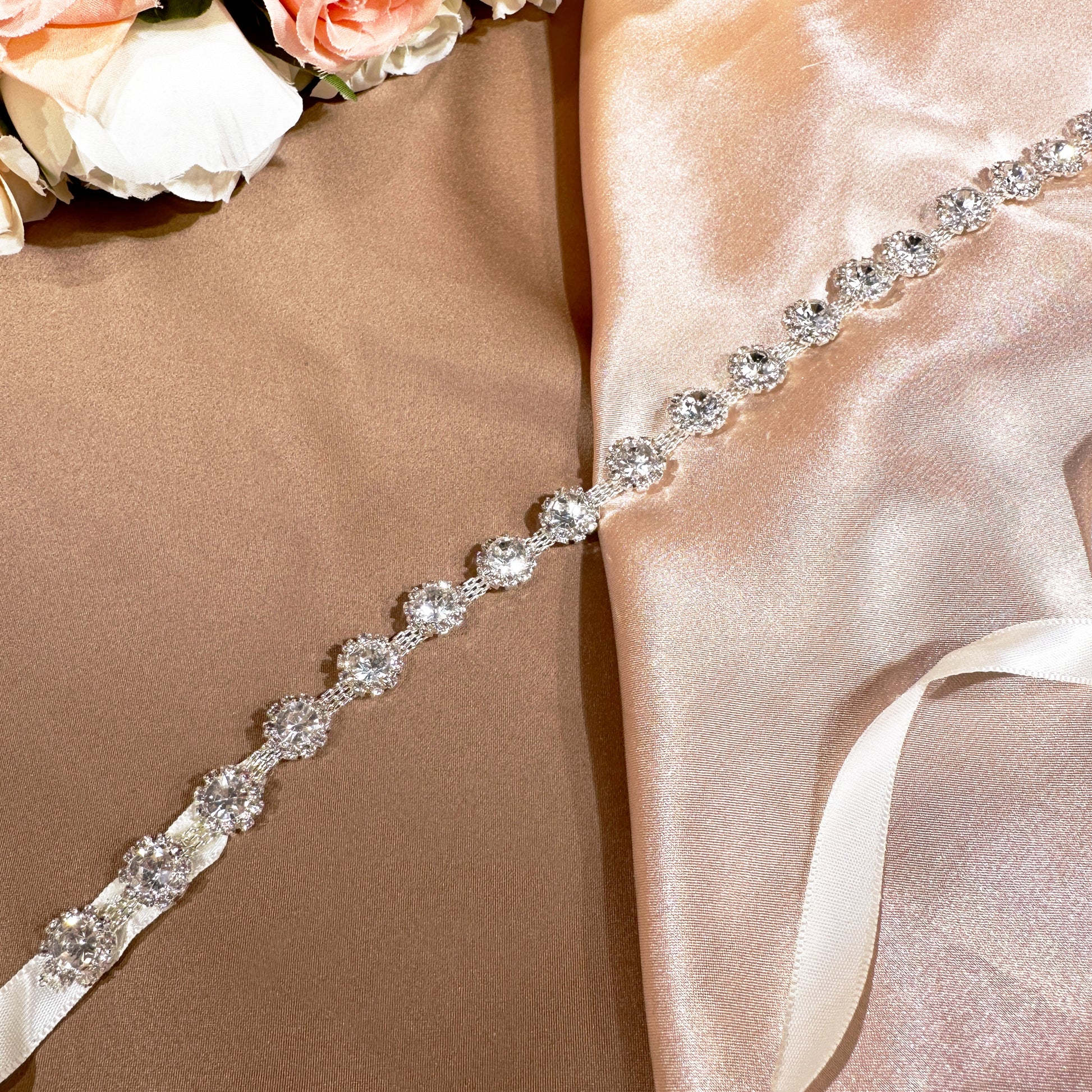 Our delicate rhinestone bridal belt is a must-have accessory for any bride. Perfectly complementing any wedding dress, this belt adds a touch of glamour and sophistication to your special day.