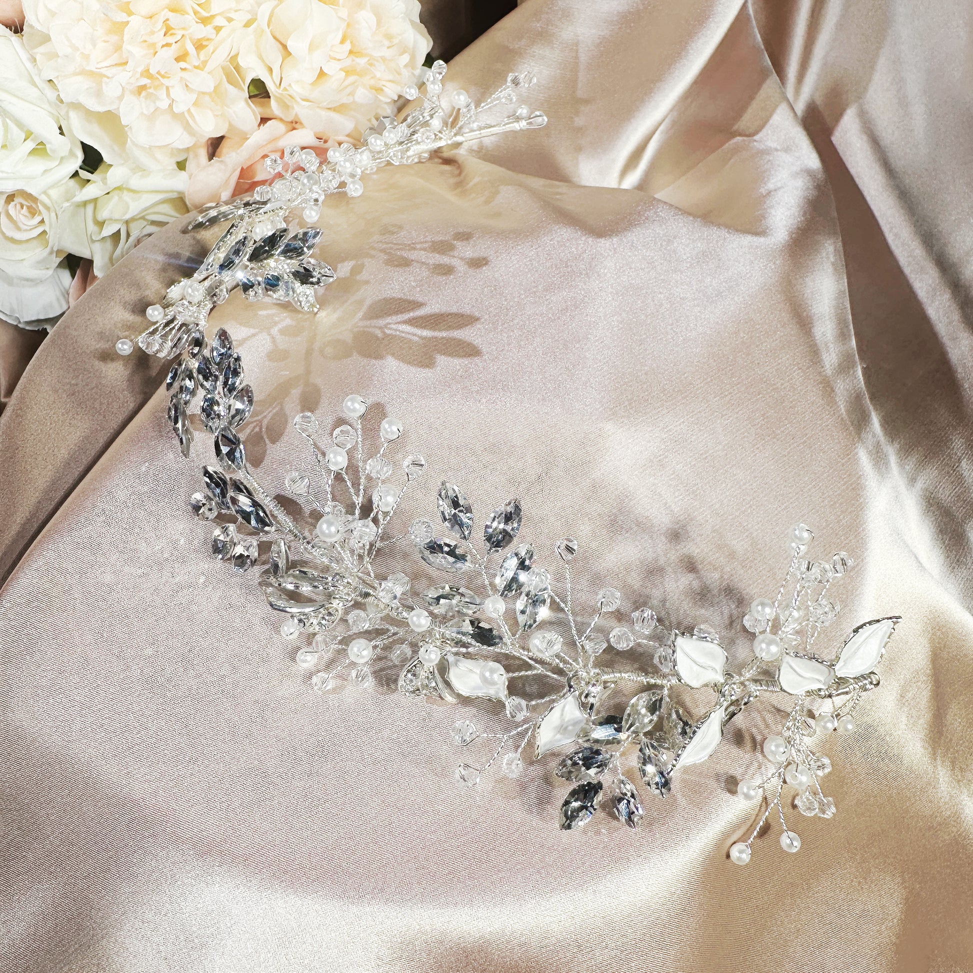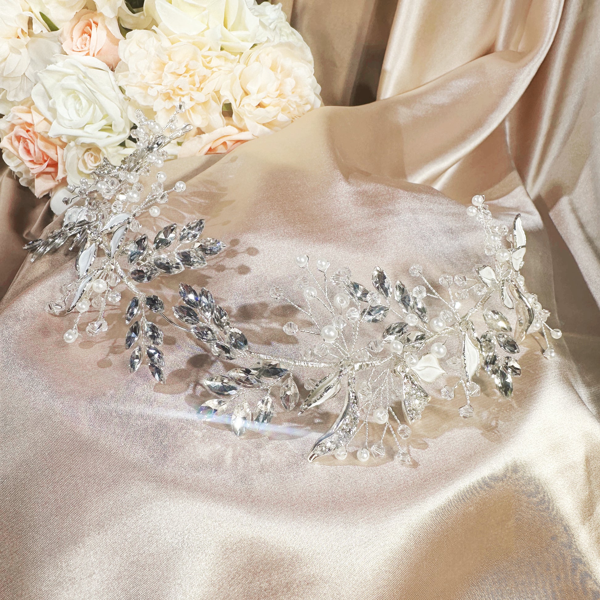 Make a stunning statement on your wedding day with our elegant leaf design rhinestone headband. Featuring a combination of radiant pearls, sparkling crystals, and intricate leaf motifs, this hairpiece embodies luxury and grace. The meticulous craftsmanship and attention to detail ensure a comfortable fit and a head-turning effect. With its versatile design, this headband can beautifully complement a variety of bridal hairstyles, adding a touch of sophistication and enchantment to your overall look. Create a mesmerizing bridal ensemble that exudes elegance and captures the essence of romance.