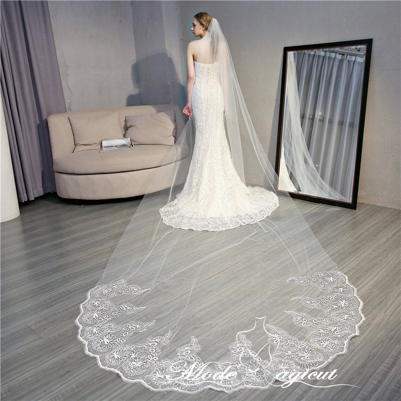 #14308007 4*1.6 Meters One-tier Sequins Lace Applique Edge Cathedral Bridal Veils with Comb